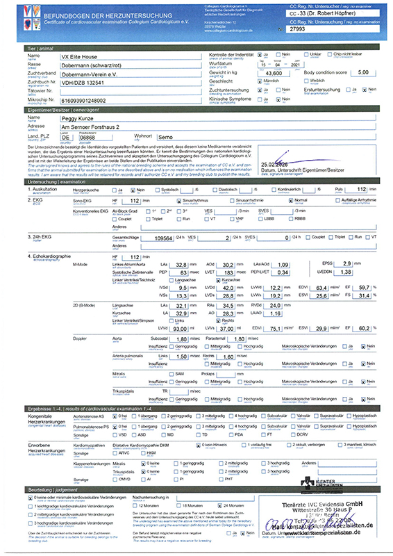 HD 1, ED 0, vWd-clear, D locus D/D, B locus B/b